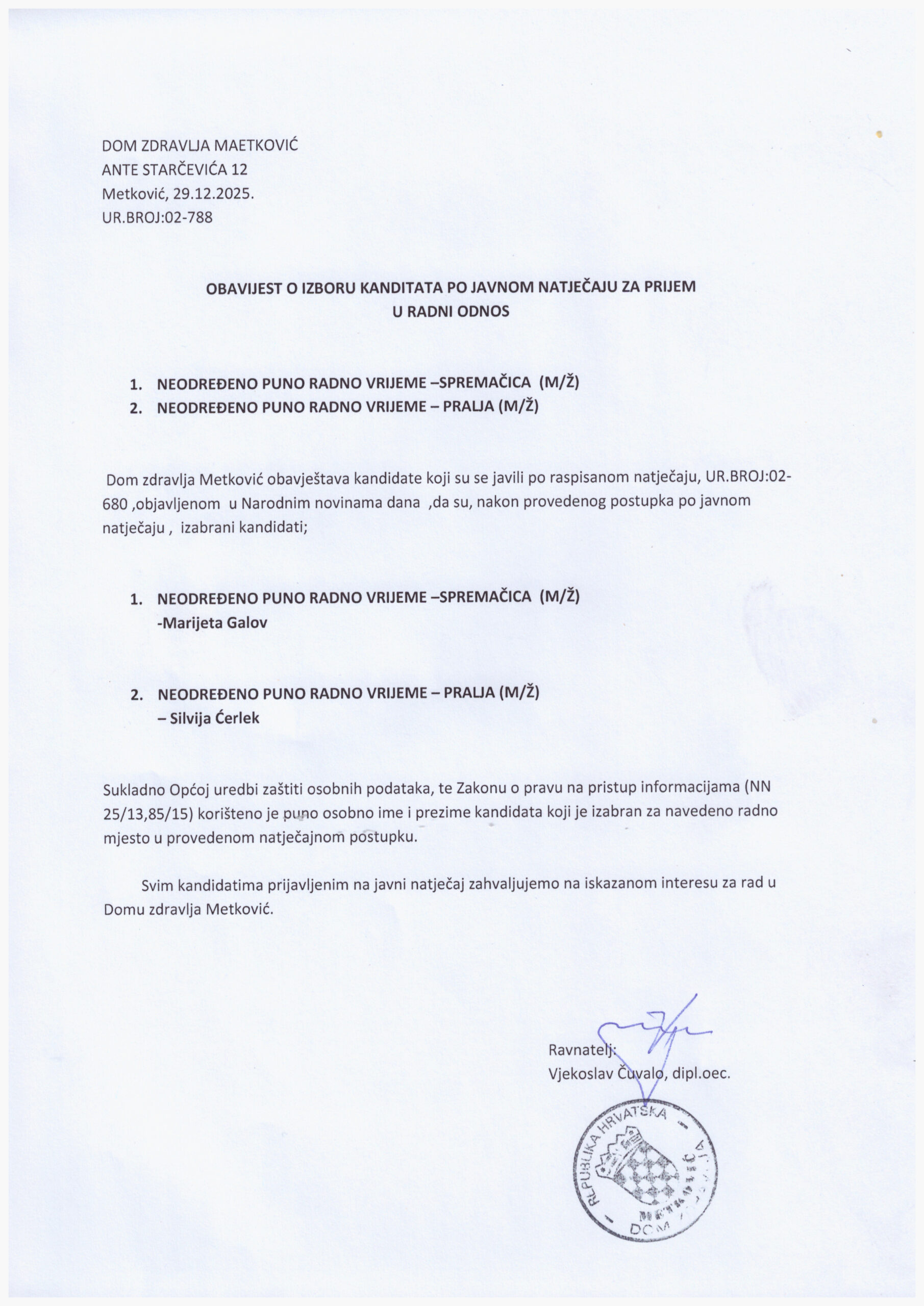- Obavijest o izboru kandidata – dr.med.opća medicina
